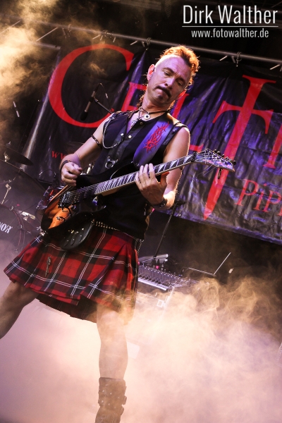 Doch genug der einleitenden Worte: Zunächst begannen drei Musiker auf einzelne Trommeln einzuschlagen und schufen so einen militärischen Marschierrhythmus. Nach der Ansage “Please welcome aboard: Celtica!” setze die Dudelsackmusik des Openers Cape Horn von Oceans Of Fire, dem aktuellen zweiten Album der Band, ein. Die geballte Kraft der zwei Dudelsäcke, einem Keyboard sowie Bass, Gitarre und Schlagzeug ging augenblicklich in Mark und Bein. Treibend, energisch, schottisch regte die Musik zum Abgehen an. Auch Gravel Walks, Itchy Fingers (vom ersten Album Rising), Jolly Roger sowie The Last Voyage Of The Great Michael bildeten hier keine Ausnahme.