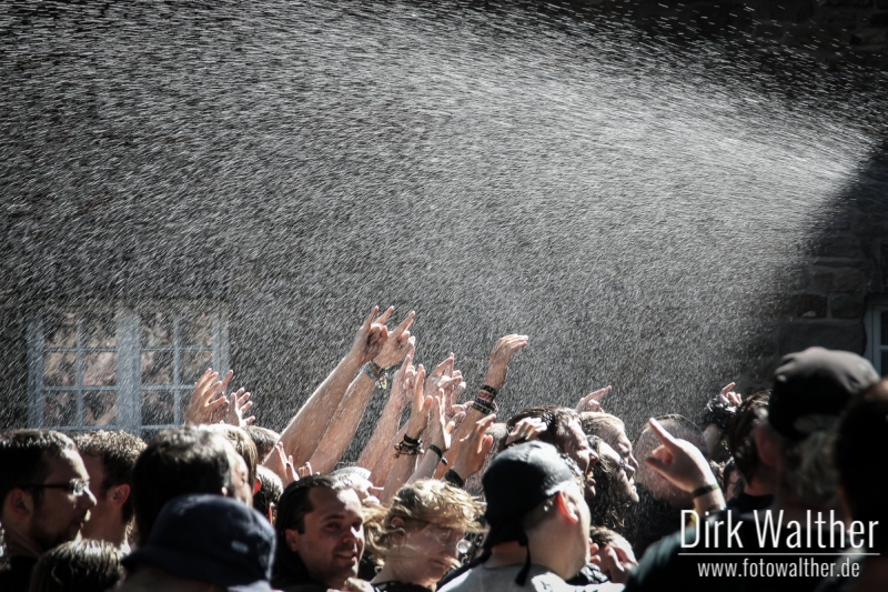 Daraufhin fragte Fenris “Wollt ihr es laut? Wollt ihr es schnell? Wollt ihr es böse?” worauf die Fans drei Mal mit einem lauten “Ja” antworten. Dann bekamen die Besucher des Burgfolk auch einen richtigen Knaller um die Ohren gefeuert: Diaboli. Bei diesem teuflischen Song wurden die Fans auch wieder zur Abkühlung nass gemacht.