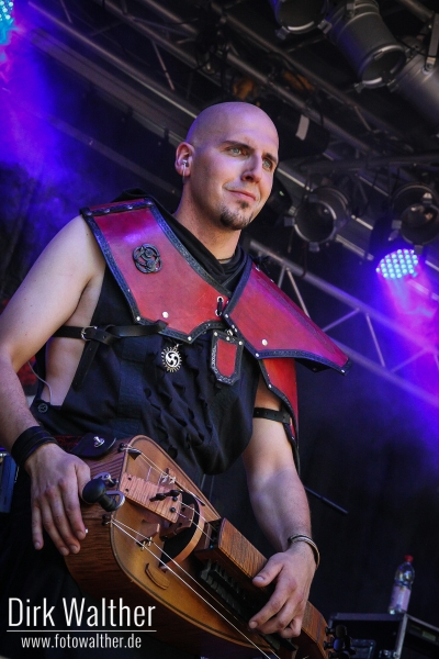 Mit Ingrimm aus Regensburg stand im Anschluss die vermutlich härteste Band des diesjährigen Festivals auf der Bühne. Nach dem Intro begann der Auftritt mit Eisenwind, das von Fronter Fenris mit einem fetten Growl eingeleitet wurde, während die “namenlose” Geigerin, die auch auf der Bandhomepage nicht als Mitglied aufgeführt ist, durch wildes Headbangen die Blicke auf sich zog. Die männlichen Bandmitglieder hatten sich dafür in aufwändige Harnsiche gekleidet. Ansonsten bestimmten heftige Doublebass-Attaacken und virtuoses Spiel an den Saiteninstrumenten sowie der Drehleier die Musik von Ingrimm.