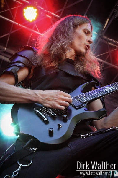 Auf den Auftritt von Cromdale freute mich besonders, da ich die Band – obgleich ich ihre Alben schon seit einer gefühlten Ewigkeit höre – zuvor noch nie live gesehen hatte. Unter kräftigen Trommelschlägen betraten die Musiker um Sänger und Gitarrist Thomas die Bühne, auf der sich übrigens auch ein schottischer Zweihänder (das Claymore-Schwert), dem die Band ihren Namen verdankt, befand. Während Dudelsackspieler Madiel mit seinem Instrument dazustieß, klatschten alle Bandmitglieder im Takt, um die Besucher ebenfalls zum Klatschen zu animieren, ehe der der Ohrwurmsong Claymore an Fahrt aufnahm. Zwar war es immer noch nicht wirklich voll auf dem Schlosshof, aber es füllte sich stetig weiter und die bereits anwesenden Fans gingen von Beginn an gut ab.