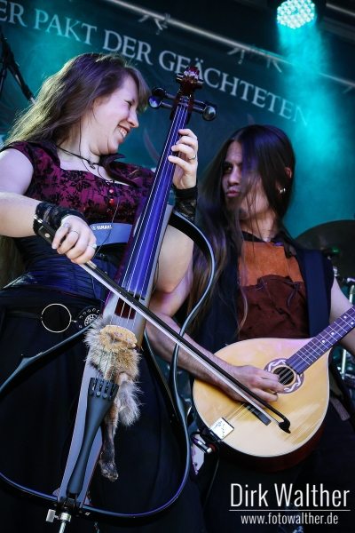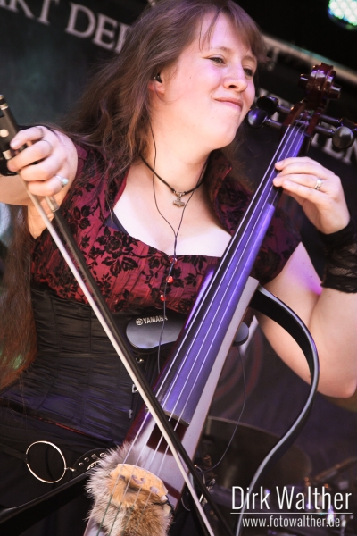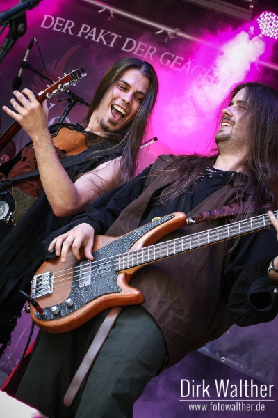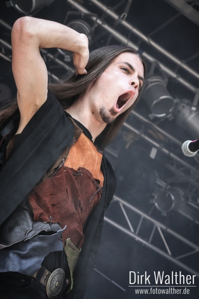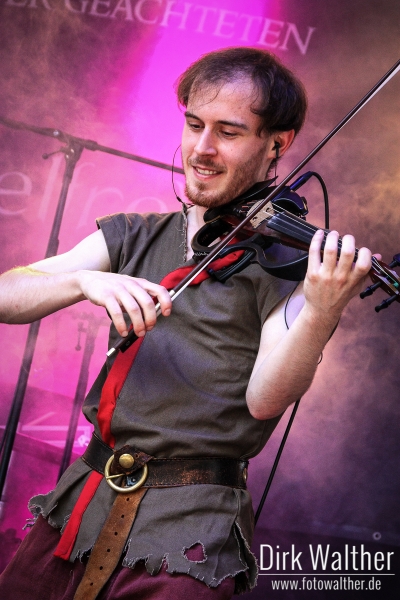 Schon mit dem Opener Düsterpflicht machte die Formation jedoch alles richtig. Sobald das Intro verklungen war, feuerte Sänger Jannik Schmidt augenblicklich die Besucher an, die auch gleich die Fäuste in die Lüfte reckten. Musikalisch bestimmten zwar vor allem Cello und Geige das musikalische Klangbild, in Kombination mit dem vielseitigen mal tiefen, mal klaren Gesang von Jannik sowie den gängigen Rock-Instrumenten Gitarre, Bass und Schlagzeug erschuf die Band jedoch eine geniale Mischung aus Mittelalterock, Folk und Metal, die von Anfang an zu begeistern wusste. Während den Gesangspausen im ersten Lied sorgte Jannik, der überhaupt sehr agil auftrat, mit einer fanfarenartigen Flöteneinlagen für noch mehr Aufsehen, so dass es auch nicht verwunderte, dass kontinuierlich mehr Besucher vor die Bühne pilgerten.