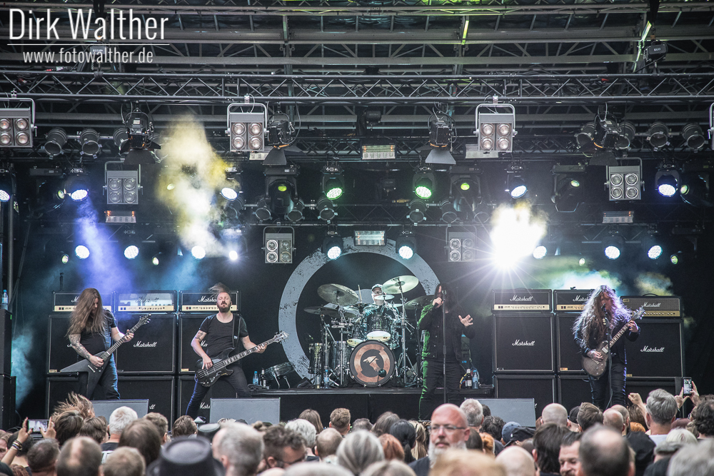 Los ging es nach einem Intro fulminant mit The Last Battle und Never Surrender. Der dritte gespielte Song Kings of Ragnarök stammte vom neuen Album Armageddon. Hierzu kam Morgana Le Fay, die die Band regelmäßig als Gastsängerin begleitet, auf die Bühne, um für mit ihren tiefen Growls und Shouts für noch mehr Stimmung zu sorgen. Auch im weiteren Verlauf kam Morgana Le Fay für eine ganze Reihe weiterer Songs auf die Bühne – teils auch mit unterschiedlichen Outfits.