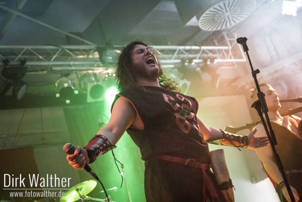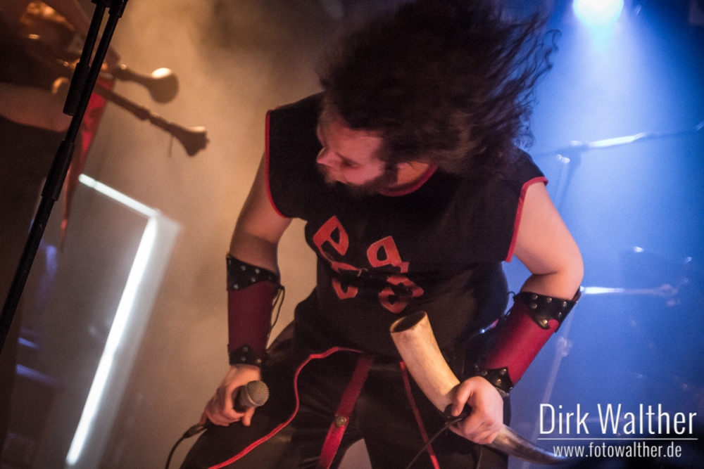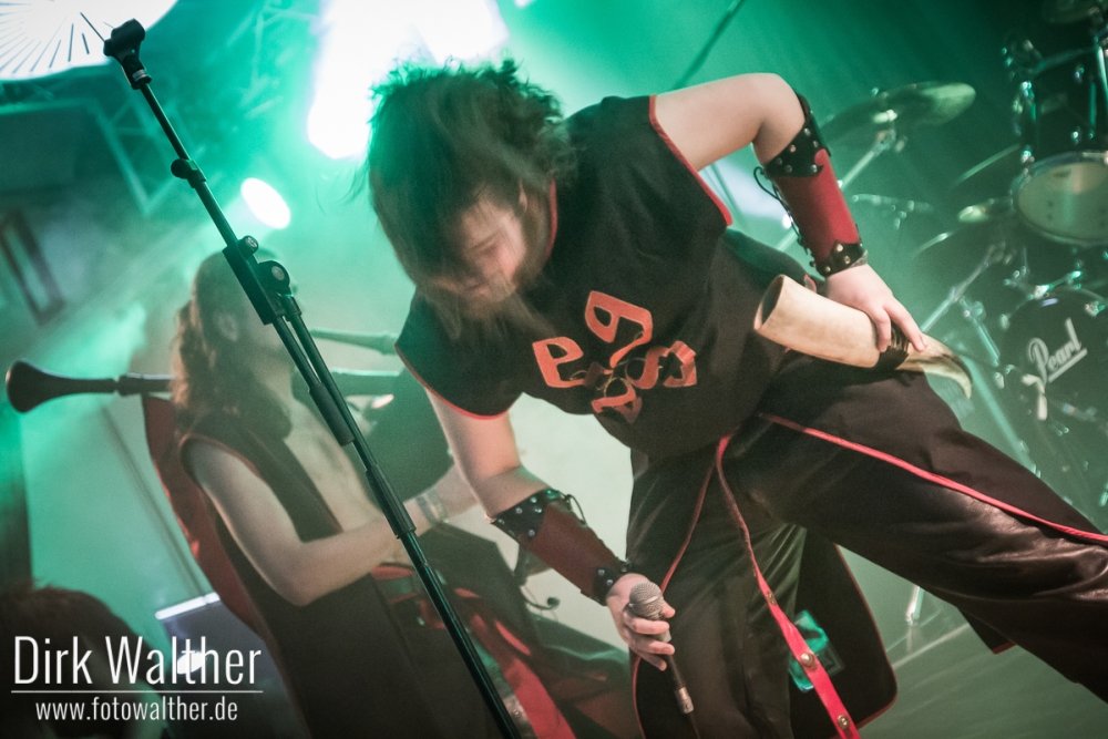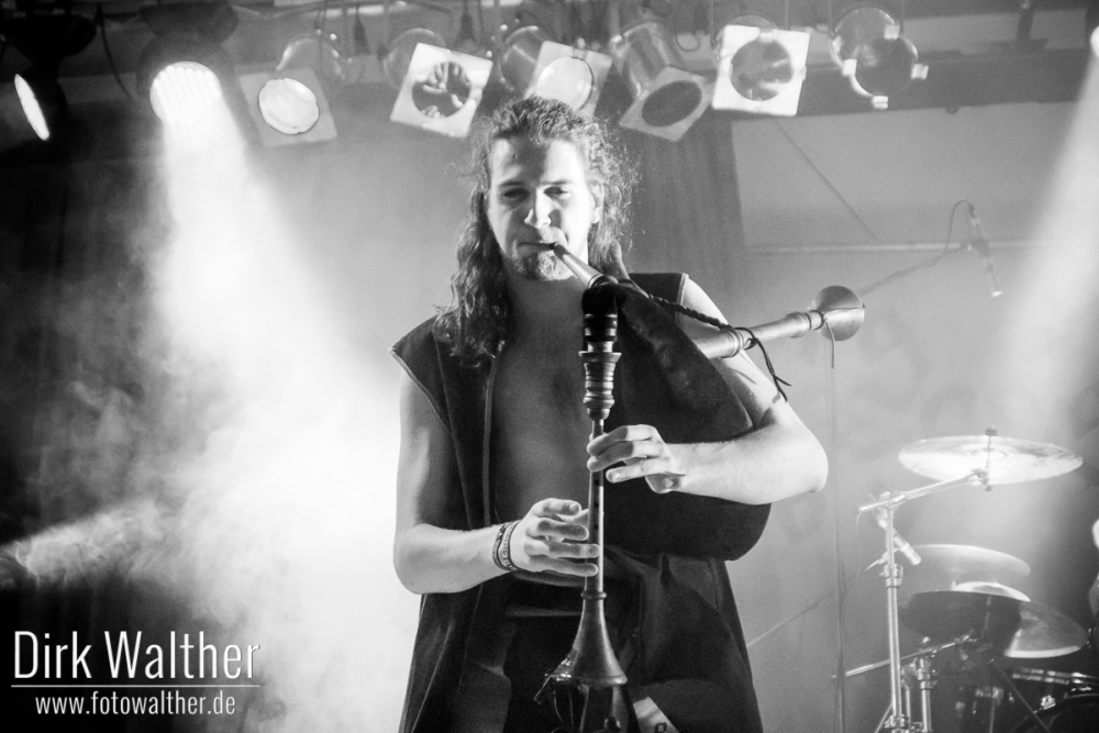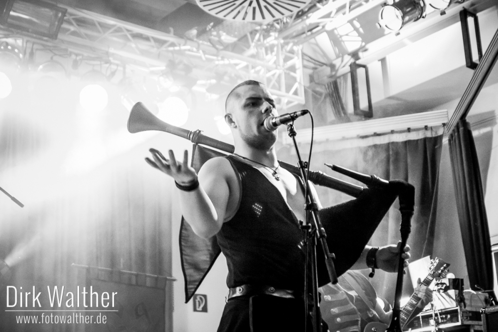 „Wir sind Haggefugg, was seid ihr?“, hallte der Schlachtruf der Mittelalter Rocker von Haggefugg schon kurz nach Beginn des Auftritts erstmals durch die Halle. Lautstark schallte es umgehend vom Publikum zurück: „Haggefoll!“ Keine Frage, etliche der Anwesenden kannten die Band schon im Vorfeld, waren sie doch mit dem Prozedere bestens vertraut. Die sechs Spielleut aus Köln, die sich auf die Fahne geschrieben haben, mit dem Publikum – ich zitiere – „Fässer zu leeren und zu Tanzen, bis die Füße stinken“ gaben alles, um ihren Worten Taten folgen zu lassen, der Meute ordentlich einzuheizen sowie den Bierausschank gehörig anzukurbeln. Und was soll ich sagen? Das Konzept ging aber mal sowas von auf! Dass mich eine Mittelalter-Rock-Band zuletzt so umgehauen hat, ist lange her. Die sympathischen Kerle um Sänger Yannick, die auch nach dem Auftritt noch für den ein oder anderen Plausch parat standen, werden das Genre zwar nicht revolutionieren, machten ihren Job dafür aber fast schon so solide wie etablierte Szenegrößen. In klassischer Rockbesetzung, die wie üblich durch allerlei folkige Instrumente wie Schalmei und Dudelsäcke ergänzt wird, angetreten, konnten sowohl eigene Nummern – hier seien vor allem die drei allesamt großartigen Songs Lebe dein Leben, Ruf der Ferne sowie der „Evergreen“ Plattgesoffen, die sich zum Teil auch auf der ersten in Eigenregie produzierten EP befinden, erwähnt – als auch bekannte Melodien wie etwa Ai vis lo lop restlos überzeugen. Von den Jungs wird man in Zukunft (hoffentlich!) noch einiges hören.