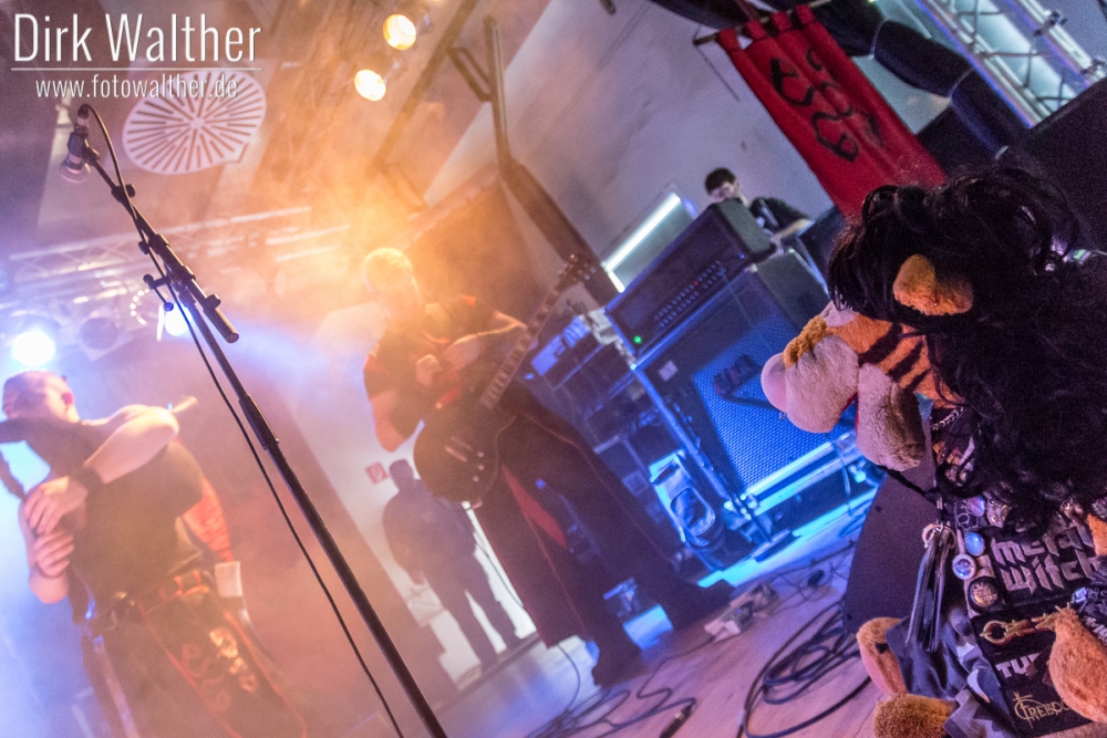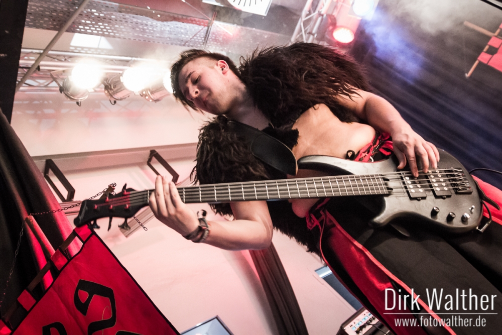 Auf die Hessischen Power-Metaller Dragonsfire hatte ich mich im Vorfeld besonders gefreut, schließlich lag das letzte Konzert, bei dem ich dabei war, schon wieder fünf Jahre zurück (für die, die es interessiert: es war beim Metal City Festival XIV in Lünen). In der Zwischenzeit hatte sich einiges – leider auch Tragisches – bei Dragonsfire ereignet. Anfang 2015 starb völlig überraschend Sänger, Bassist und Gründungsmitglied Torsten Thassilo Herbert, weshalb die Band erst einmal alle weiteren Aktivitäten auf Eis legte. Glücklicherweise entschied man sich, die Band fortzuführen. Mai 2015 wurde schließlich Frank Richter als neuer Sänger von Dragonsfire vorgestellt. Rückblickend auf das Konzert bei der Metal Invasion kann ich nur sagen: Chapeau! Der neue Mann am Mikro macht seine Sache super und auch der Rest der Band stellte eindrucksvoll unter Beweis, dass es die richtige Entscheidung war, das Projekt Dragonsfire fortzuführen. Egal ob Songs wie der Opener Blood For Blood, Klassiker wie Raging Fire oder der Kracher Burning For Metal zum Abschluss – die Musik und das gesamte Auftreten der Band strotzten nur so vor Spielfreude. Auch die Ansagen waren wie üblich herrlich amüsant (erwähnen muss man  hier etwa die obligatorischen Blödeleien vor dem reichlich Kopfkino auslösenden Titel Steel Eel) und natürlich zerlegte Schlagzeuger Jan Müller nach kurzer Zeit direkt die erste Ladung Drumsticks. So muss es sein, das ist der Spirit of Metal! Sehr geil war übrigens auch der Gastauftritt von Patrick, seines Zeichens Sänger bei der Kölner Formation Sic Zone, auf dessen „Hodenlosfalsett“ die Band gerne aufbaute. Die Parole Dragonsfire Rockxxx wurde bei der Metal Invasion wieder einmal wörtlich genommen, daher verwunderte es auch nicht, dass weite Teile des Publikums Band gebührend abfeierten.