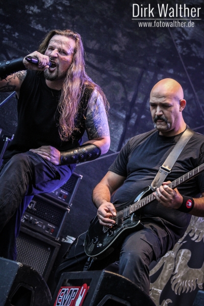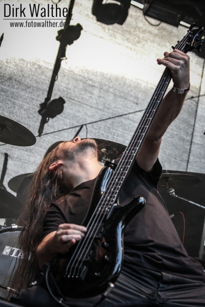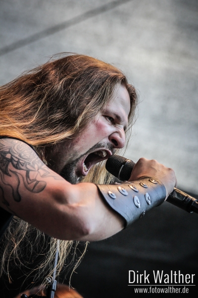 Obscurity gaben sich besonders Mühe, das Publikum anzuheizen. “Scheiß auf’s Wetter!” ertönte es schon zu Beginn des Auftritts aus den Boxen. “Wir sind hier um Party zu machen”, stellte Fronter Agalaz sofort klar. Und eine Party lieferten Obscurity in der Tat ab. Crowdsurfer vor und wild headbangende Musiker auf der Bühne sorgten für reichlich Stimmung. Shouter Agalaz erkundete auch mehrmals selbst den Fotograben, um mit den Fans abzufeiern. Kein Wunder also, dass Agalaz am Ende des Auftritts etwas aus der Puste kam und vor der grandiosen Zugabe Nordmänner verkündete: “Ein allerletzter Song, sonst fall ich hier runter!”