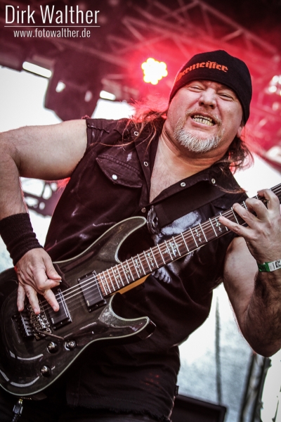 Sänger Brian Ross, das einzige verbliebene Gründungsmitglied, und seine neue Crew, die er nach mehrjähriger Pause im Jahr 2012 zusammengetrommelt hatte, lieferten einen astreinen Heavy Metal Gassenhauer nach dem anderen ab. Am besten symbolisierte wohl der Kracher Back From Hell – vom gleichnamigen neuen Album, das die Band übrigens noch vor dem eigentlichen Release-Date schon zum Verkauf anbot – den extrem kurzweiligen Auftritt und die (gelungene) Wiederauferstehung dieser genialen Band! Aber auch I’m Not Insane, bei dem Sänger Brian Ross sehr schön den Verrückten mimte oder auch Dog City konnten restlos überzeugen. Vor der Bühne hatten sich derweil reichlich Anhänger der True/Heavy Metal-Fraktion eingefunden, die während der Auftritte von Blitzkrieg und den zwei folgenden Bands für mächtig Stimmung sorgten und den Lautstärke- sowie Alkoholpegel auf einem konstant hohen Level hielten.